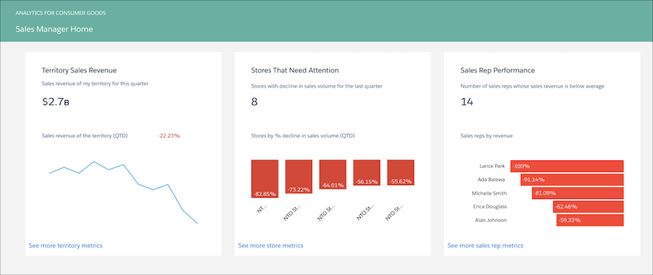 - Einstein Analytics for Consumer Goods is only for Salesforce Consumer Goods Cloud users. To create an app from the Einstein Analytics for Consumer Goods template, you must also have the Lightning Retail Execution add-on license. Sales managers can use the app to increase sales, improve store compliance, identify stores at risk, and maximize sales rep effectiveness. This feature is available in Consumer Goods Cloud by late February 2020.