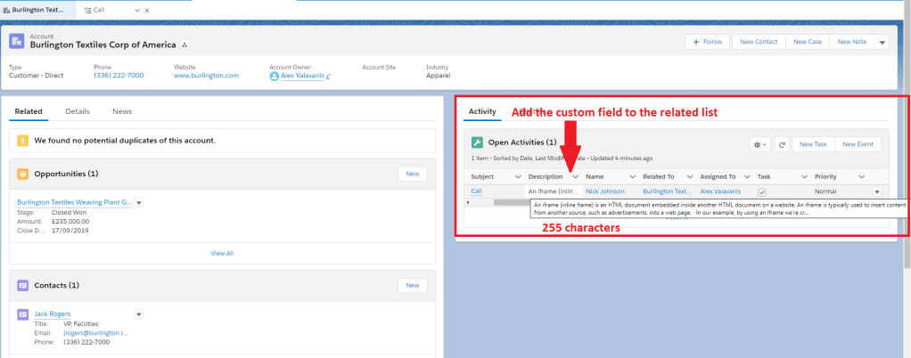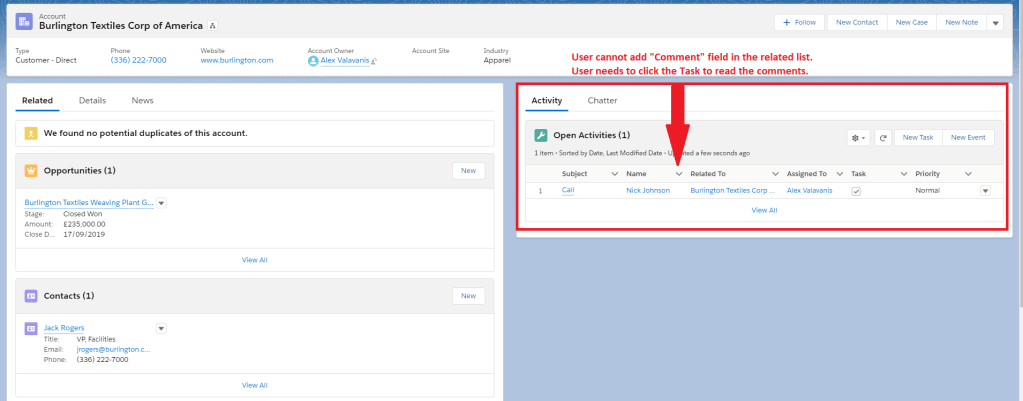 For those who are not aware, Open Activities timeline shows any notes the user has included so that he/she can have quick access to important information. Any? Well not really with this one! Salesforce will not help the users to read the “Comment/Description” field in the Open Activities Related List, which means that the page layout will look like something like this: