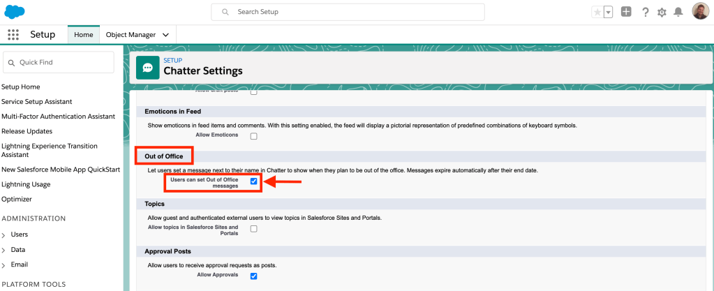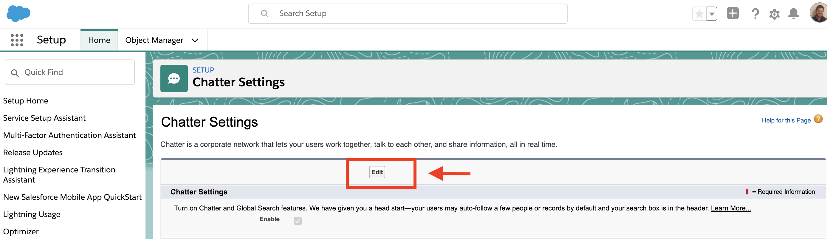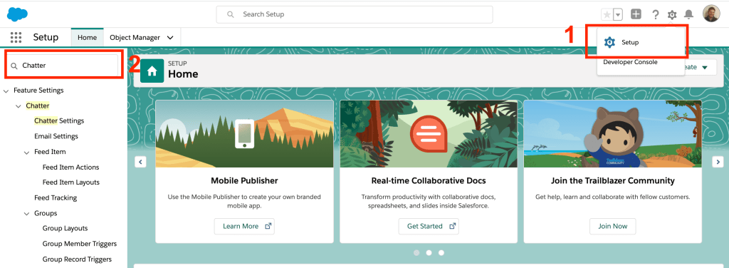 - Once you click on “Setup”, type “Chatter Settings” in the Quick Find Box.