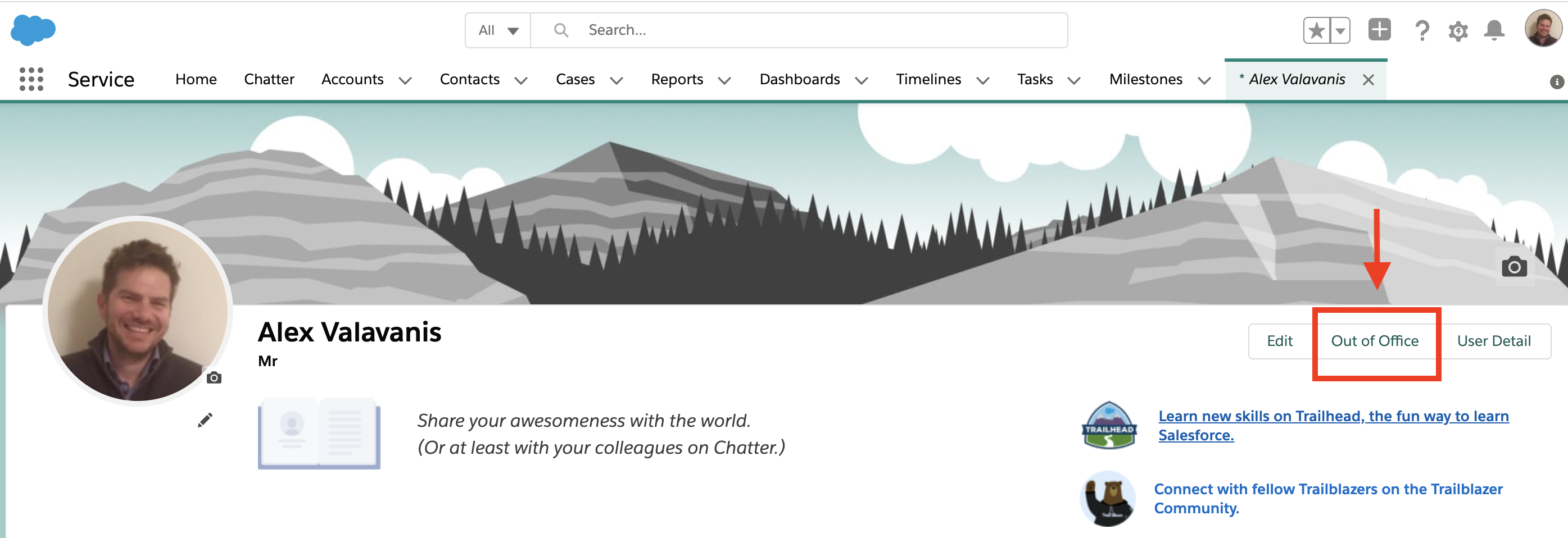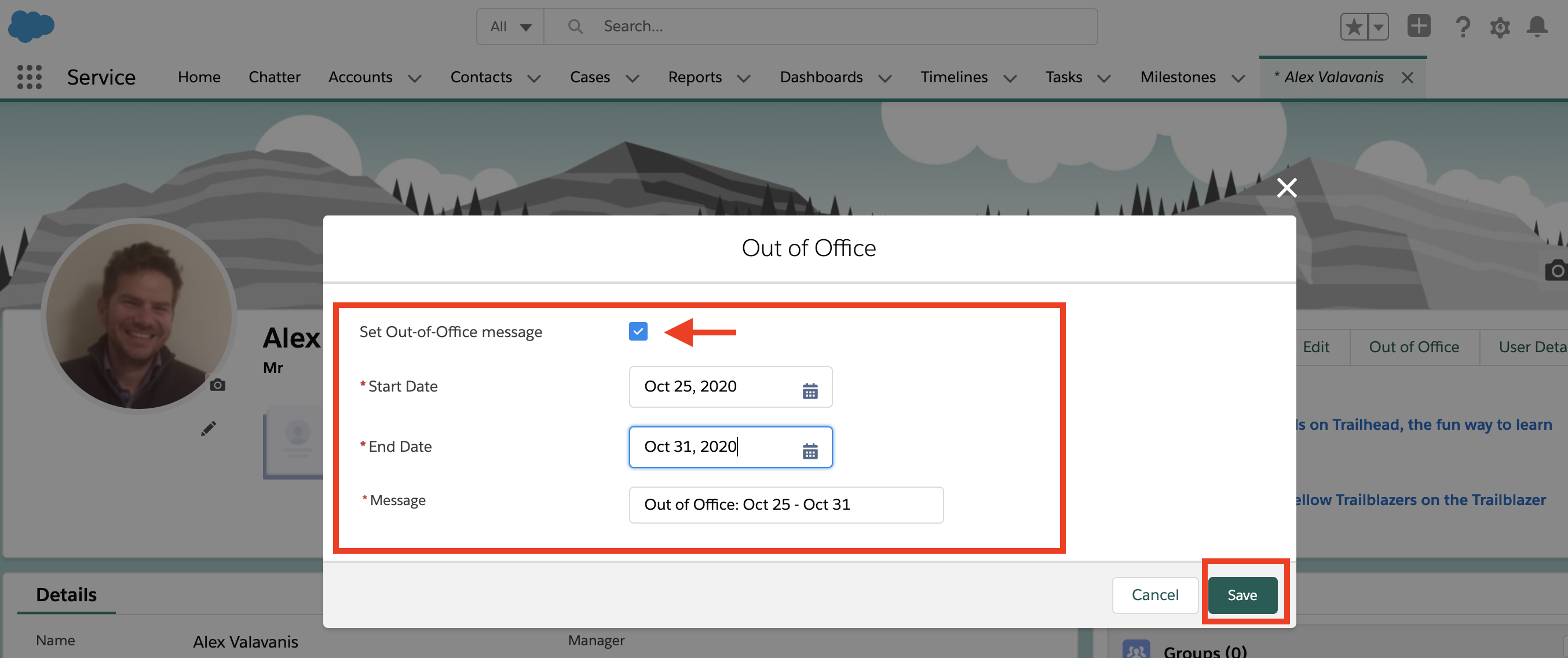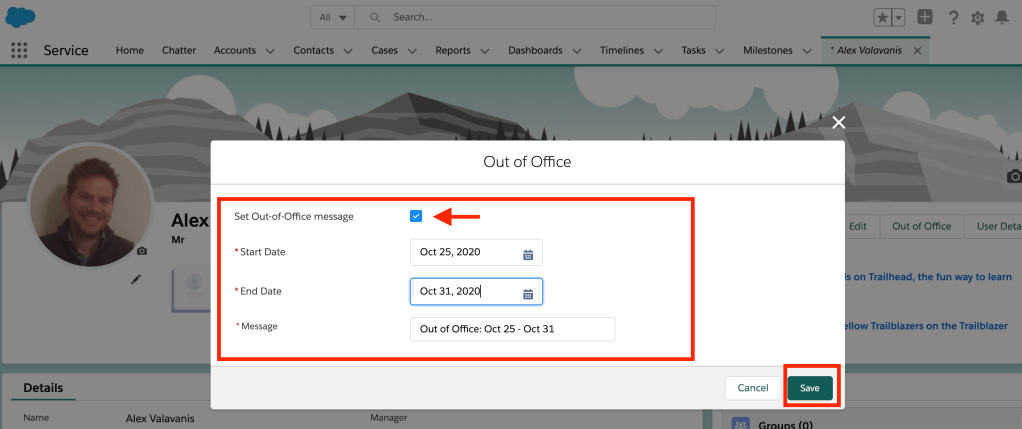 7. The “Out of Office” message is now saved and it appears next to your name.
