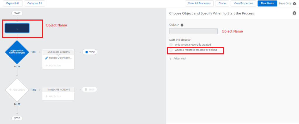Click “Add Object” to choose the object (account), when the record is edited or created.