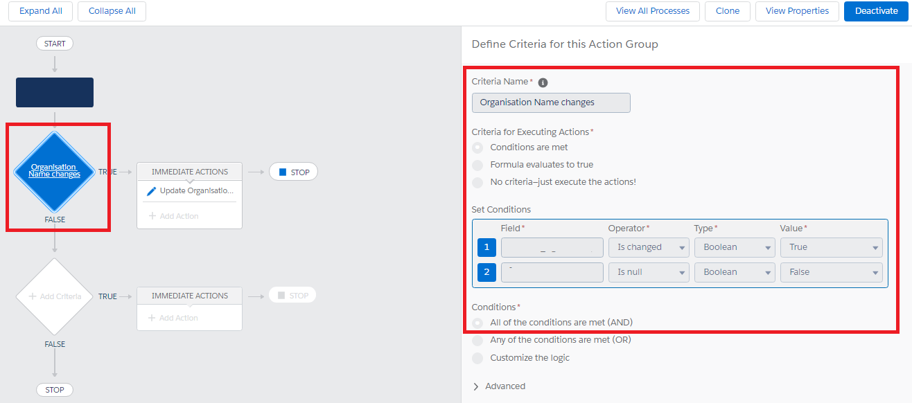 Add your criteria and name it. Make sure the Organisation Name isn’t Null and it’s changed.