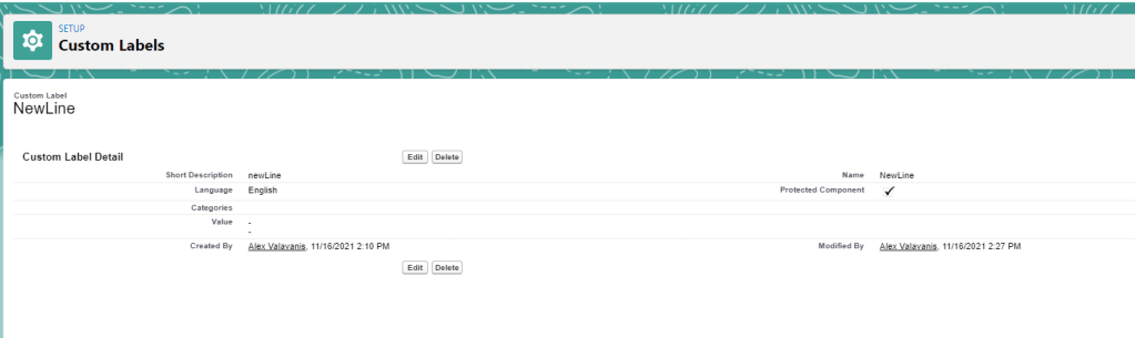 Step 2: Create a Custom Label (we will use the custom label in the flow). We will name it Label.NewLine and use it to line break the text when it is populated in the “History Status Update”. – Screenshot below