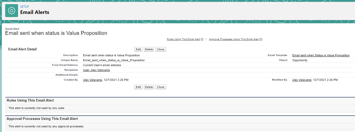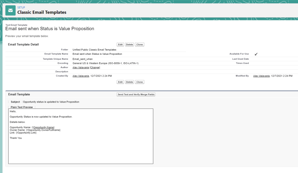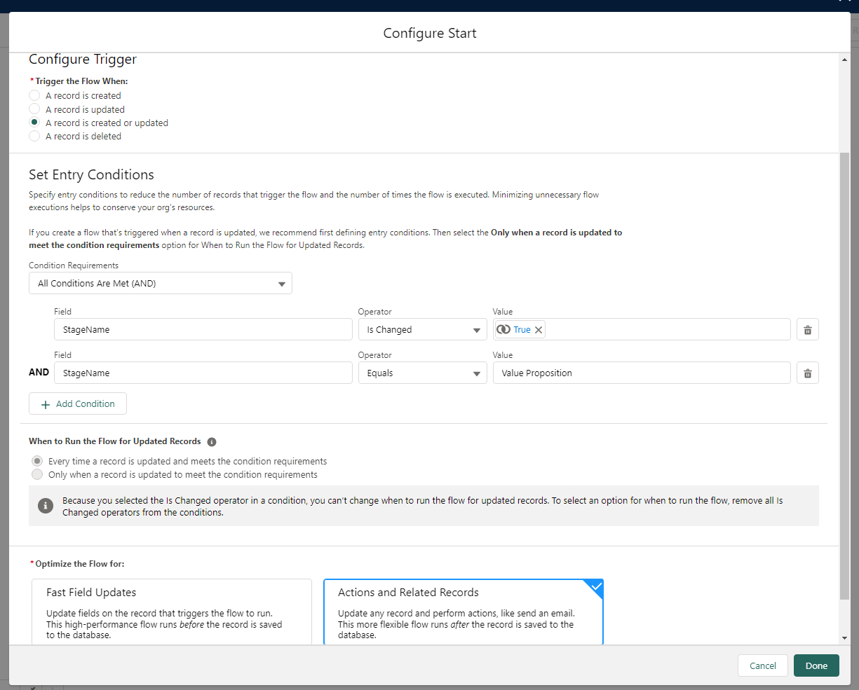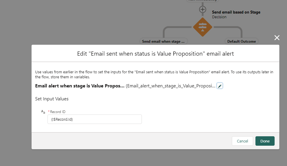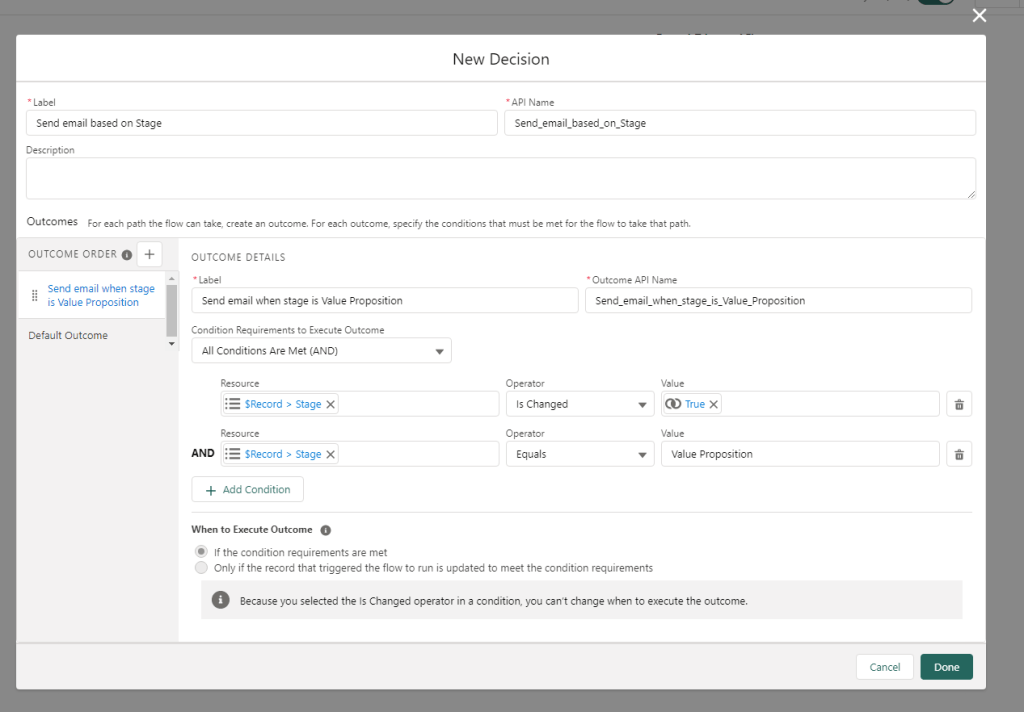 Requirement: User wants to receive an email alert when the stage is updated to “Value Proposition”. We are solutioning the request by building a flow.