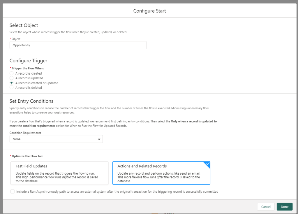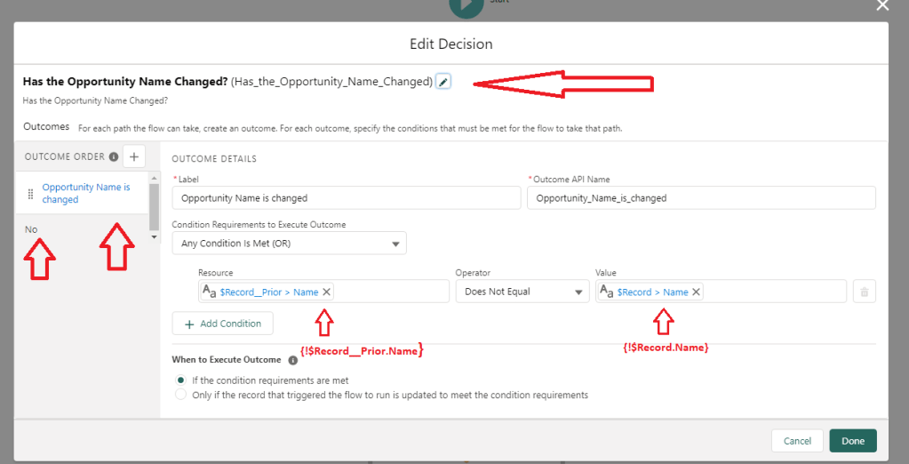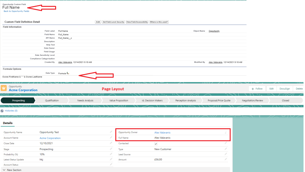 Step 2: Create a formula field in the opportunity object and name it Full Name (we will use this field in the flow – Lookup/Opportunity Owner) – Formula is “Owner.FirstName & ” ” & Owner.LastName” and will return text (you may want to hide it from the page layout if you want to)