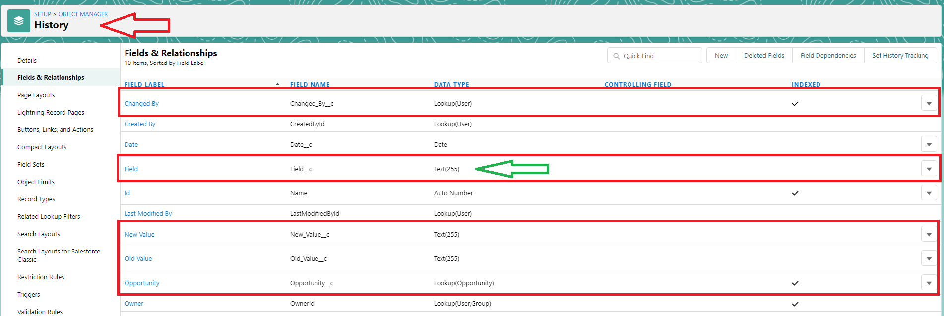 Step 1: First step is to create a custom object and some fields (screenshot below). We will name the custom object “History” and the fields will be the following: