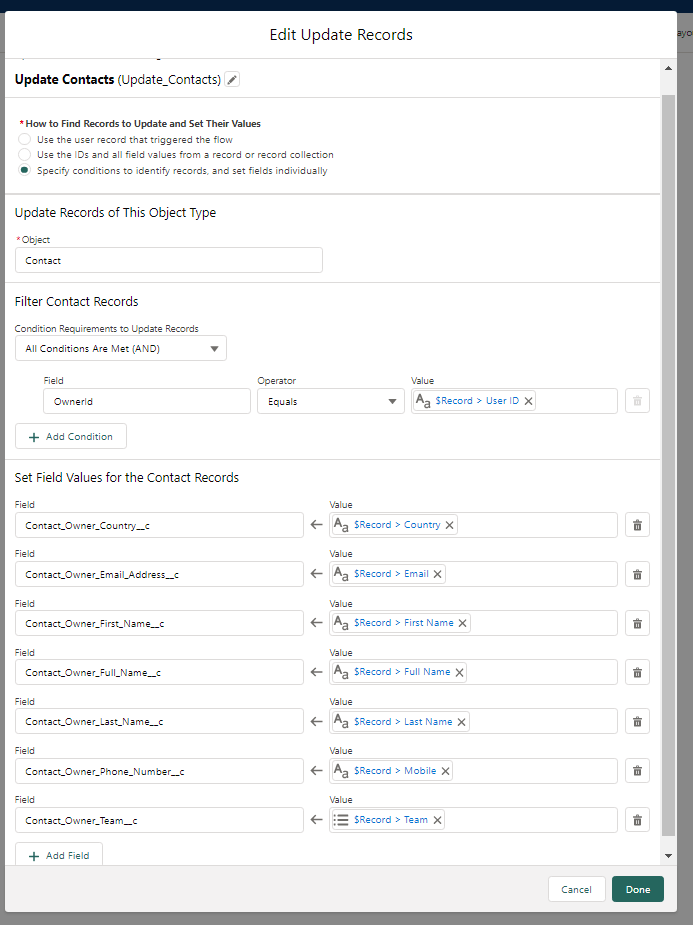 Step 3: Create the update element. For each field we created in the Contact object we are generating the record > Owner Id.