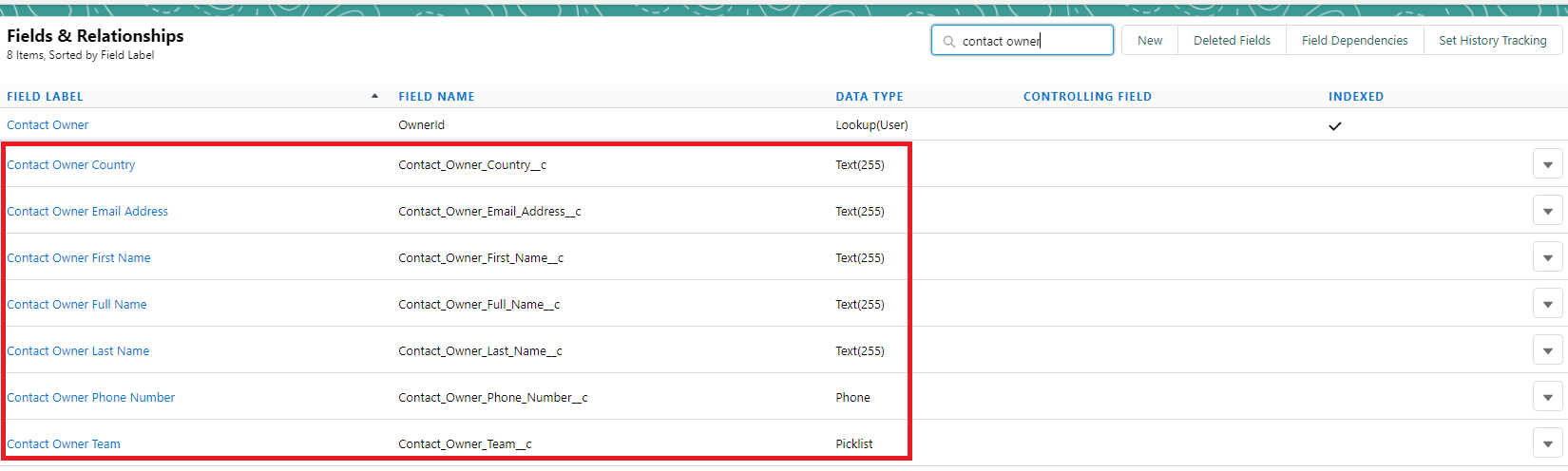 We will therefore need to create the same fields on the Contact object. The idea is that when a contact is created, flow will look at the Contact Owner (User Id), take the values from the 6 fields listed above and update the fields from the Contact object that we created below.