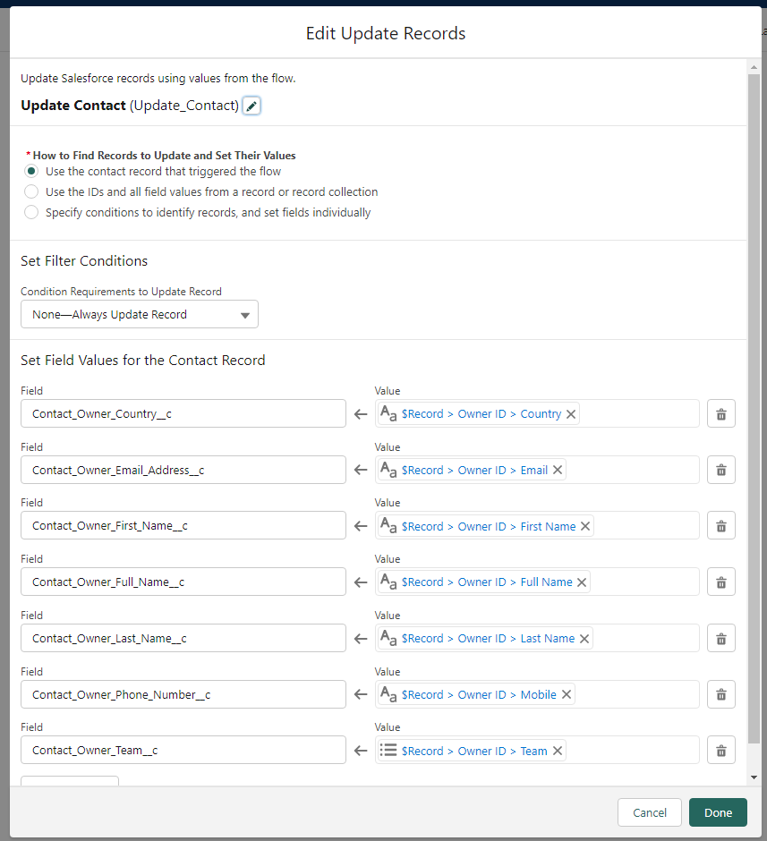 For example, for the “Contact Owner Country” field we want to generate Record > Owner Id > Country. – (Screenshot below)