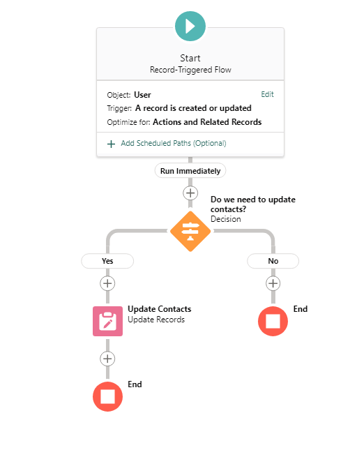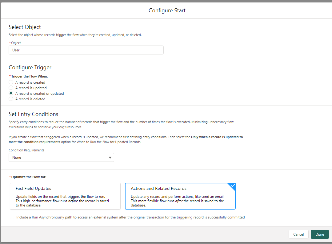 Step 5: We now need to create another Record-Triggered Flow for the User object as we also need to consider the fact that if these fields from the User record change, then that flow needs to update the fields for that contact record. For example, if the country field of a user changes, then the country field for all the contacts that have that User as a Contact Owner need to change.