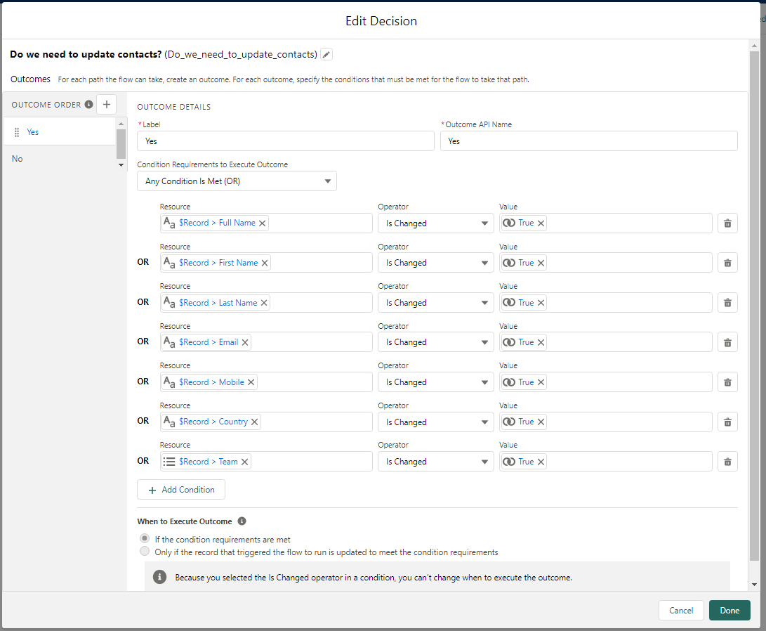 Step 6: Create a decision element. Note that we are using the “Is Changed” operator as the flow will trigger whenever the fields are changed.