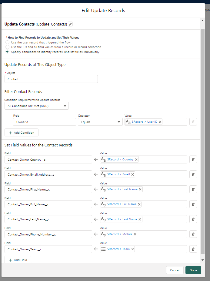 Step 3: Create the update element. For each field we created in the Contact object we are generating the record > Owner Id.