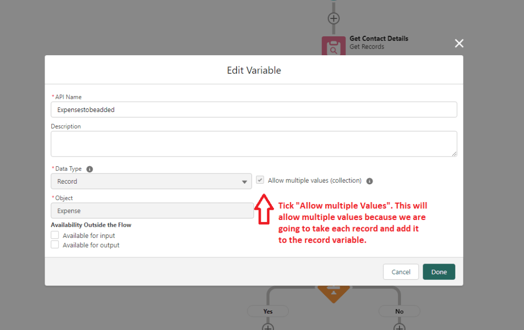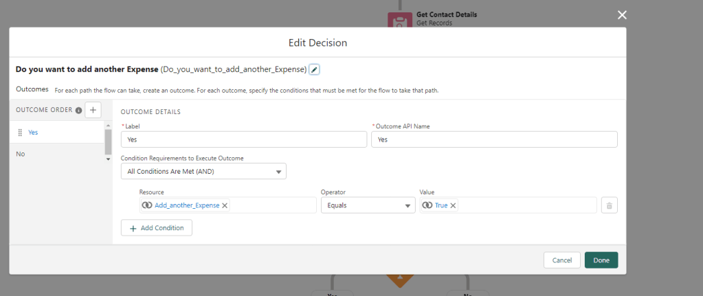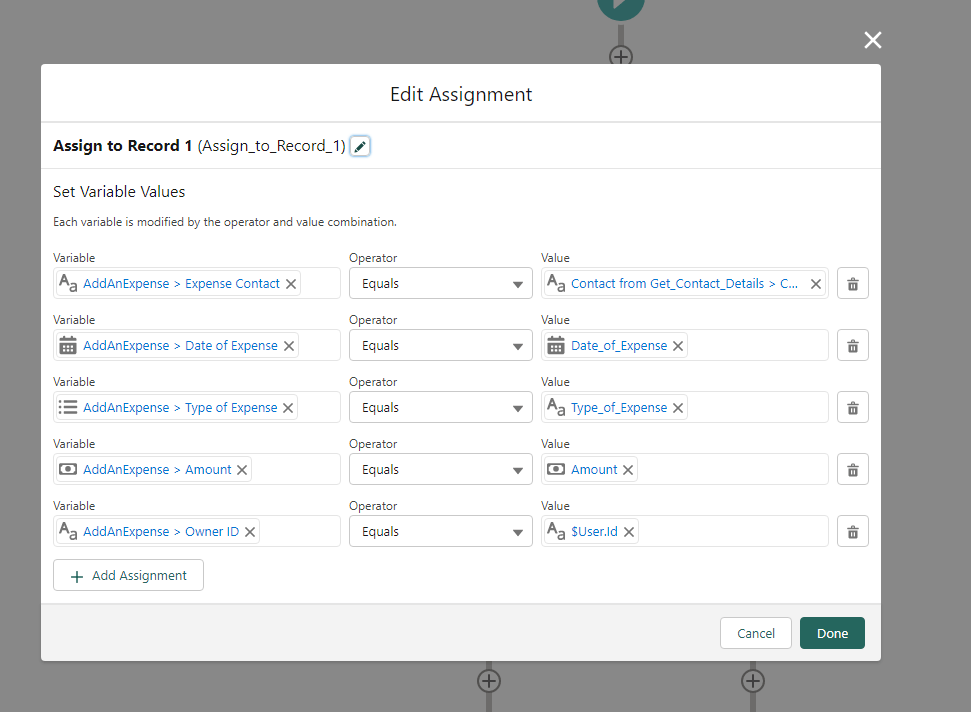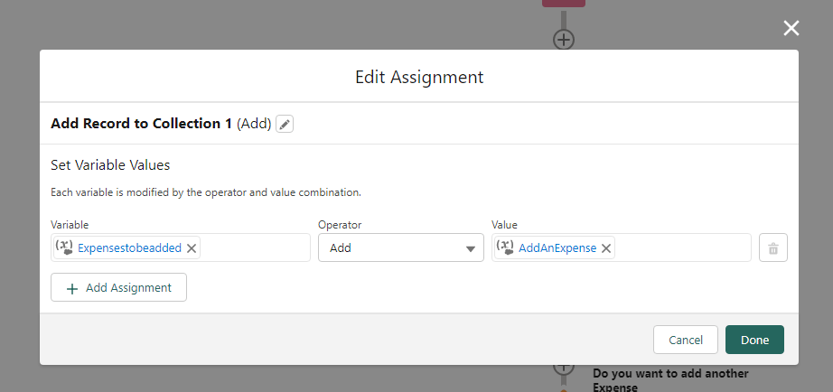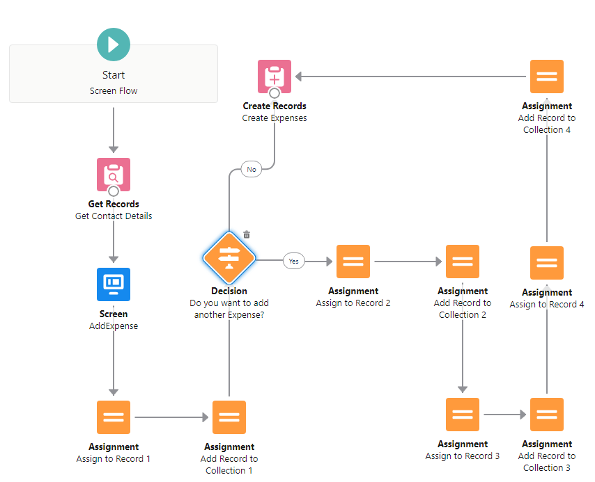 Step 9: I am creating more Assignment elements ( Assign to Record 2, Add Record to Collection 2 etc. etc.) As you will see on the video below everything on the right hand side is the same as the “Assign to Record 1, Add Record to Collection 1” elements, but everything on the left hand side it shows the second API values. You can add as many collections as you want but for this flow we created 4 (i.e. we can add up to 4 expenses) – video below