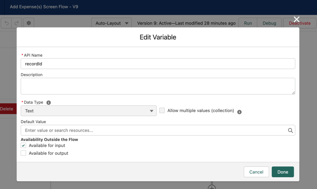 Step 4: Once we created the Screen element I need to assign this to a record so I need to create another variable to which I’m going to use to assign the screen flow to that to that record.