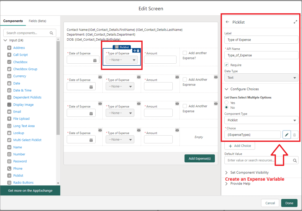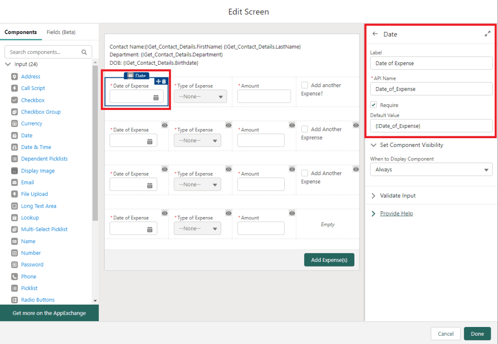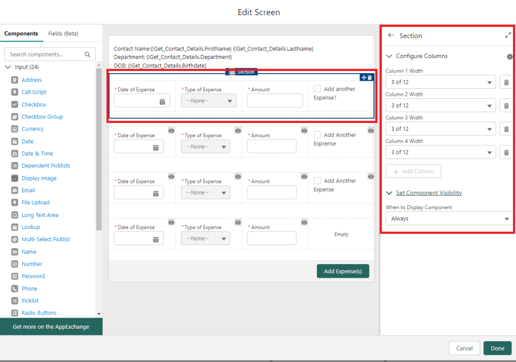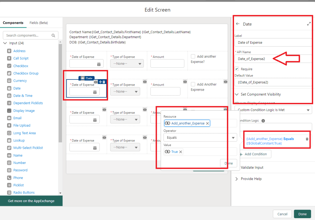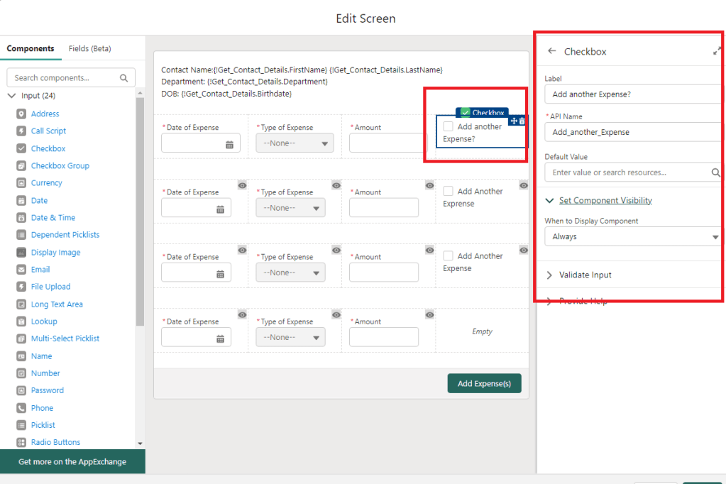 I am then creating another section, however for each Label I am creating some logic which will allow the user to view the next section if the field “Add another Expense?” is checked. Please note how I change the API’s for each label.