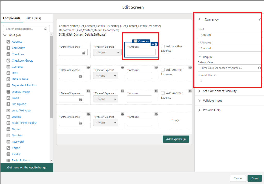 Use Case is to allow the users to create expenses from the contact object. For the below scenario we are using 4 different types of expenses and we can add up to 4 expense records. User will click on the button, a window will pop up which will include some of the contact’s details and user will add his/her expenses.