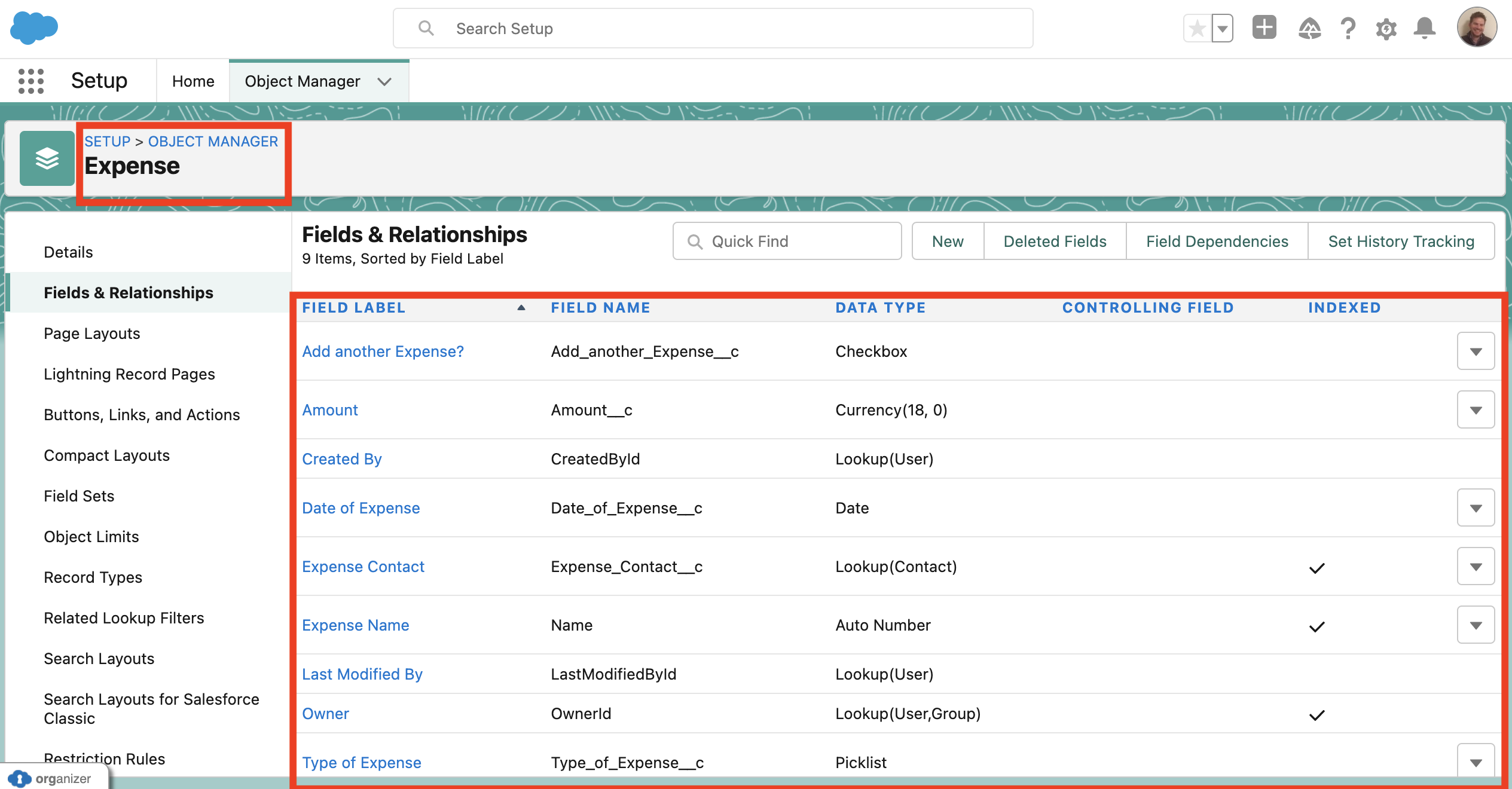 Step 1: First step is to create a custom object and name it “Expenses”. We also need to create the following fields within the object.