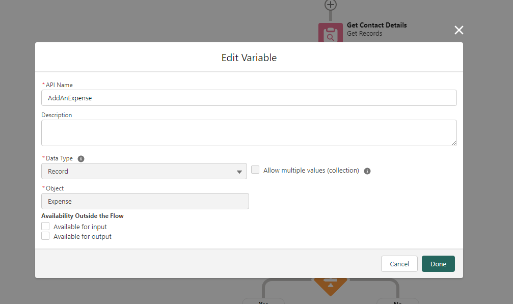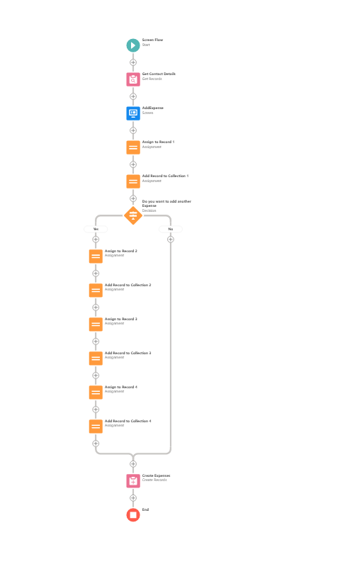Step 9: I am creating more Assignment elements ( Assign to Record 2, Add Record to Collection 2 etc. etc.) As you will see on the video below everything on the right hand side is the same as the “Assign to Record 1, Add Record to Collection 1” elements, but everything on the left hand side it shows the second API values. You can add as many collections as you want but for this flow we created 4 (i.e. we can add up to 4 expenses) – video below