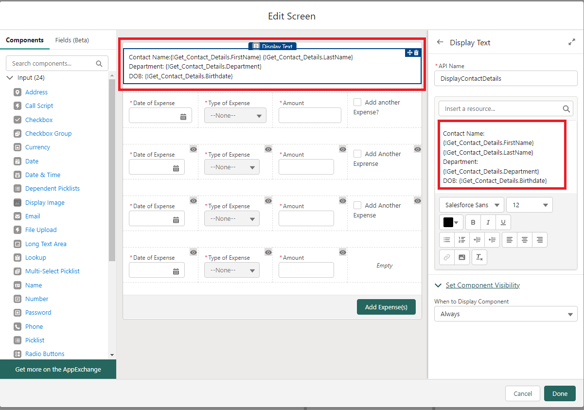 Step 3: We create the Screen Element. First i want to do is add a Display Text as my desire is to bring some details from the Contact record by using the “Get Records Contact”.