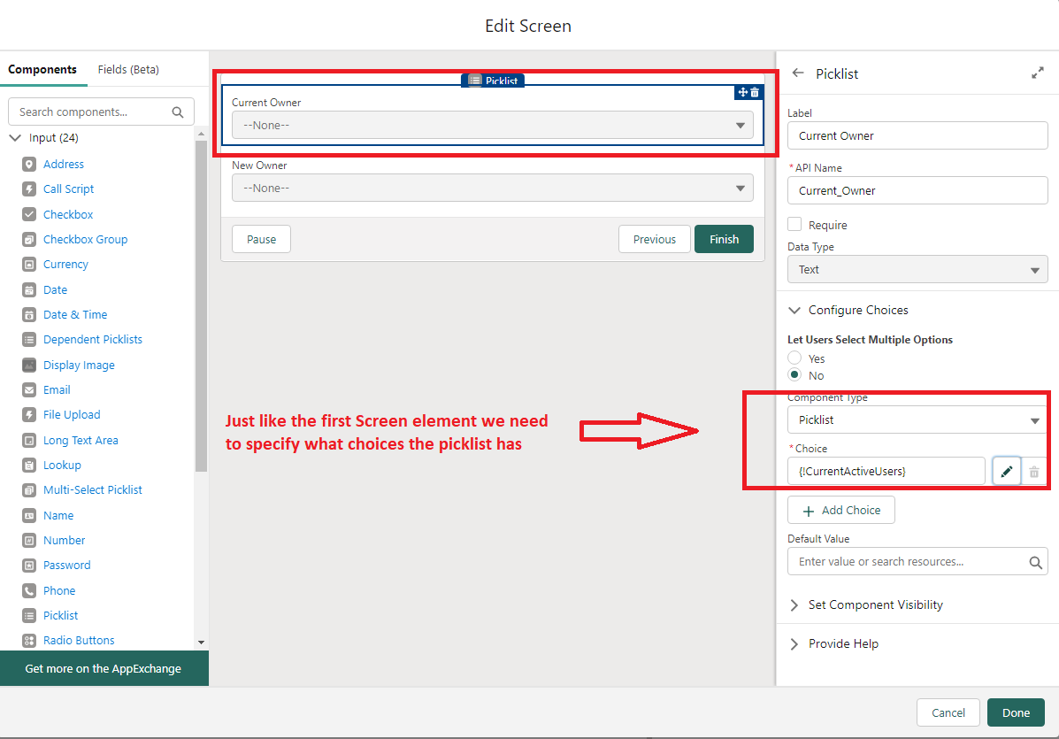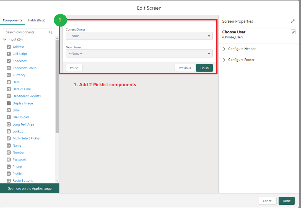 Step 2: Create your 2nd Screen Element – We will be adding 2 picklist components