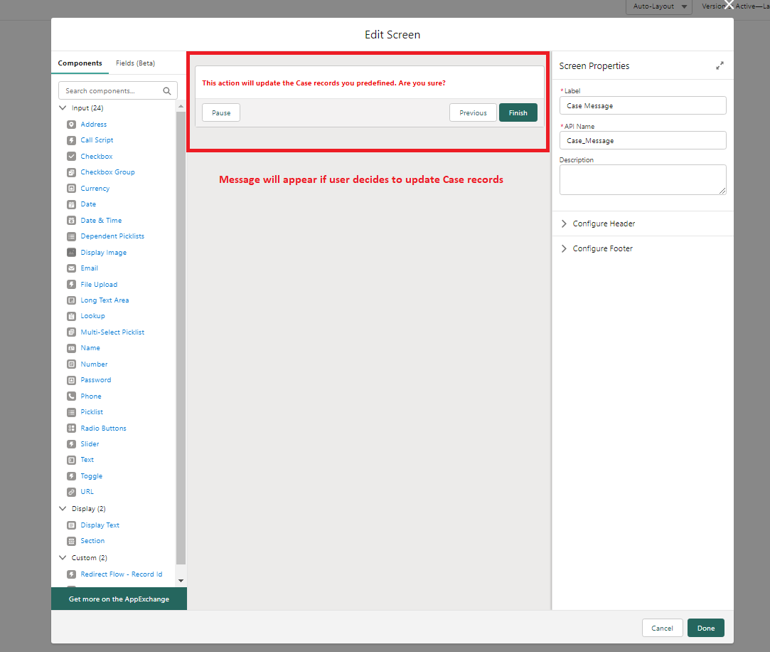 Step 4: Add another Screen Element once a decision is taken. Based on the users decision a message will appear.