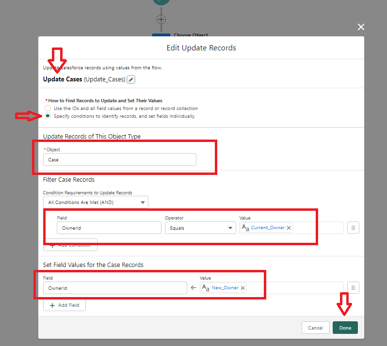 Step 5: Create Update elements (based on the decision). We want to specify any Customer or Case records whose owner is a current owner and update them to the new owner.