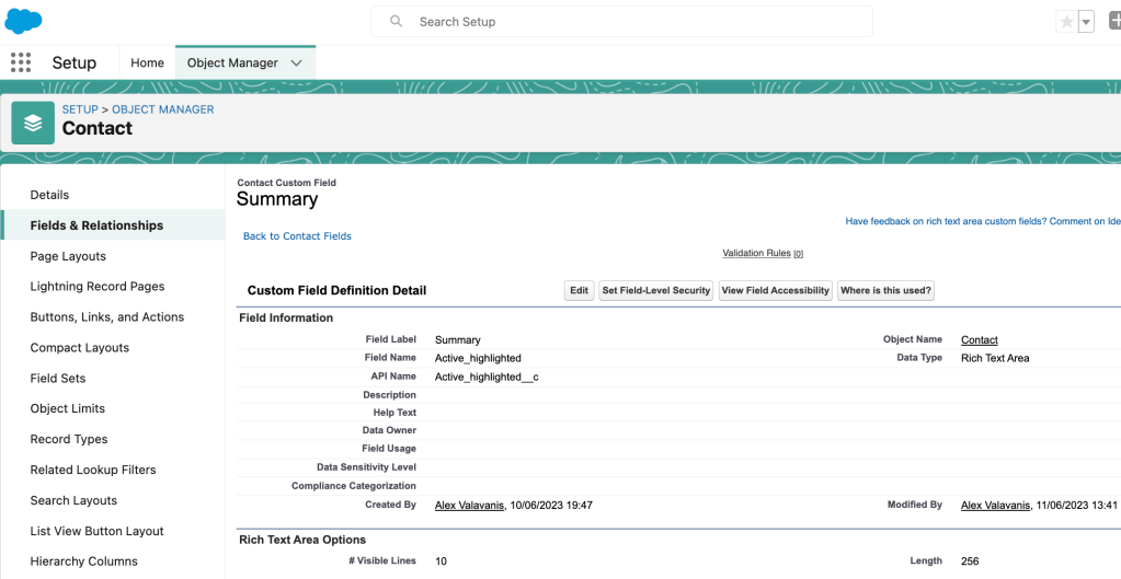 Step 1 is to create a a Rich Text field on your Contact object – Adjust the field appropriately on your page layout. See details below: