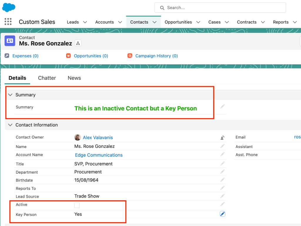 - If the contact is active and a Key Person then there should be a message saying “The contact is Active and a Key Person”.