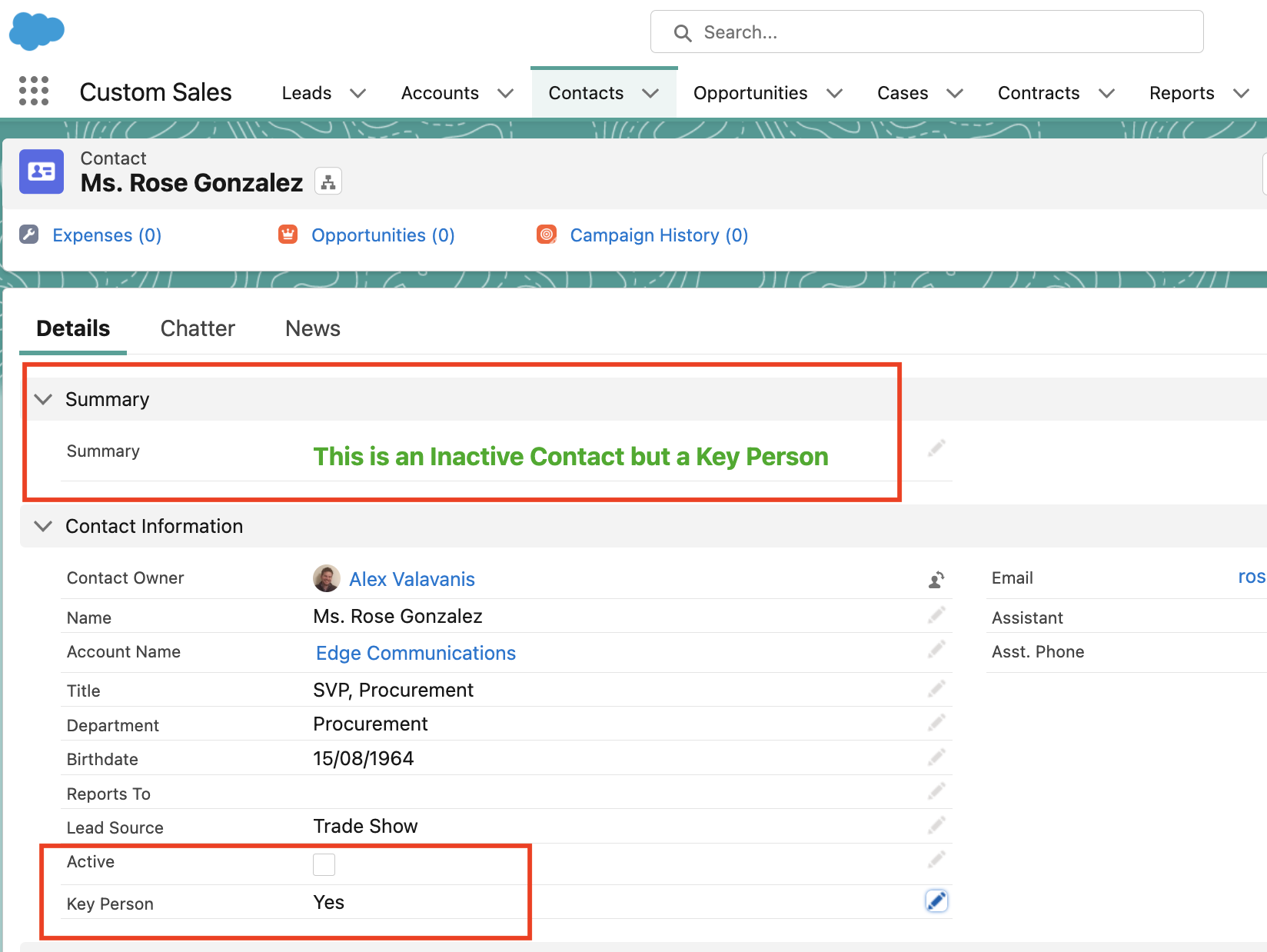 - If the contact is active and a Key Person then there should be a message saying “The contact is Active and a Key Person”.