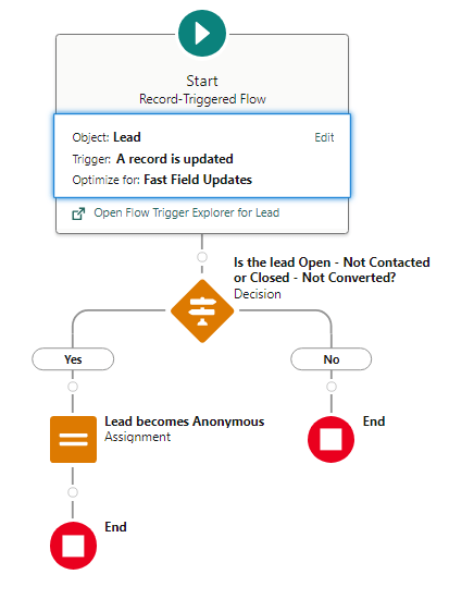 Request is to be able to anonymise records (Leads) whenever the status is equal to “Open – Not Contacted” or “Closed – Not Converted”. This will be a “Before Save” Flow with a Decision element. For the purpose of the exercise the Decision element does not include the condition on how many days after a record needs to be anonymised i.e. element includes only the Status. It also needs to be emphasized that once a record is anonymised it cannot be retrieved (i.e. data is lost for ever).